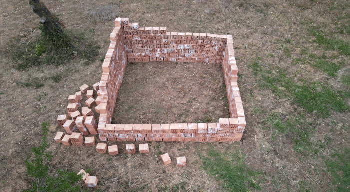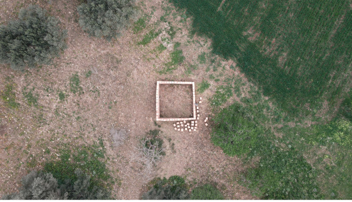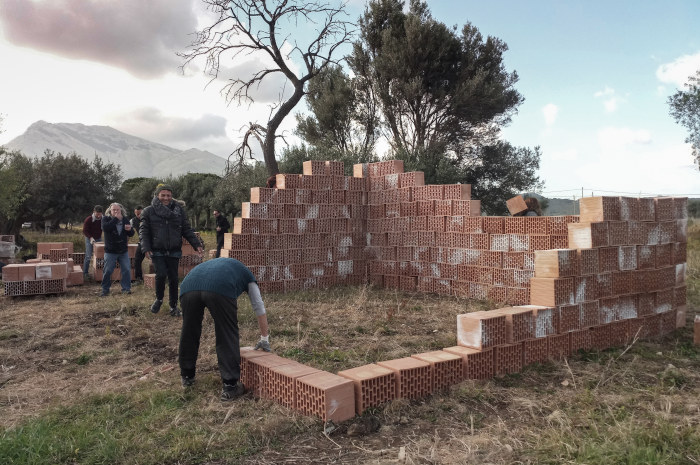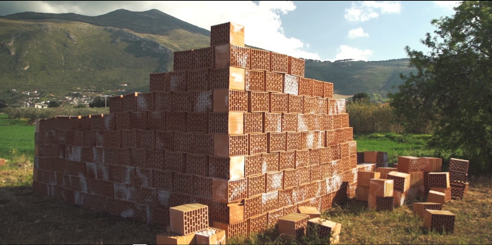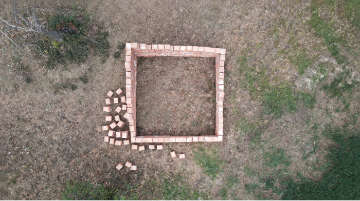 Ancora una volta ci ritroviamo di fronte la parusia dell'essere e di quale esercizio faccia per sopravvivere. Creare segni che siano caratteri. Sarà anche stato un semplice flash, realizzato però con le sembianze di quelle architetture/sculture, spesso di qualità dubbia e anche invasive, a volte addiritura deturpanti che dominano alcuni luoghi simbolici. Si è trattato di un brevissimo evento, ha sprecato pochissima energia, ha costruito una "scultura da vivere", ma solo per pochi minuti, poi è stata disassemblata. Che la simbolica traiettoria segnica di costruire/decostruire sia il nulla, d'altra parte non possiamo neanche dire. In primo luogo c'è un documento in cui è iscritta. Ma di quella forma ci rimane il suo contorno perché non ne abbiamo esperito la presenza, quindi sarà una costruzione del tutto immaginifica di un simbolo il cui segno possa essere visto dall'alto. Dall'alto come? Passando casualmente da lì con un jet privato, un elicottero, in deltaplano? Oppure con l'occhio tecnologico del potere che ci rende tutti simili ad un Forrest Gump dentro la distopia scenica del nostro quotidiano? La sua forma appare evanescente, svogliata, sbiadita, scolorata, candeggiata, un bianco vuoto. La coscienza appare così come un inedito spunto divinatorio ammantato dal silenzio dell'interdizione a spiegarlo. Il gramma fotografato dall'alto soggiace estemporaneo come un'azione scultorea di Robert Barry realizzata col gas invisibile, o come la Piramide invisibile di De Dominicis, anch'essa disegnata nella comprensione cosciente ma del tutto evanescente. I materiali che hanno composto il segno ad esclusivo miraggio di un occhio elettronico che vede dall'alto sono ritornati alla fase di acquiescenza nel loro deposito, la terra smossa dal lavorio della costruzione è riassestata con leggeri sgambettii da chi governa la proprietà. Tutto intorno tace in un silenzio grande e aurale.