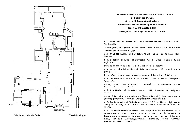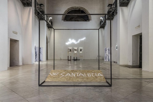 La prima sala della Galleria Civica Montevergini ospita l’opera W Santa Lucia, in cui la scritta in led, visibile da via S. Lucia alla Badia, riproduce la frase pronunciata durante i festeggiamenti della Santa a Siracusa ogni 13 dicembre. La posizione della scritta luminosa su una base di legno giace come il corpo della Santa nell’opera Il seppellimento di Santa Lucia di Caravaggio dove il pittore ritrae la Santa come una donna comune che viene uccisa sotto gli occhi della Chiesa e dello Stato. In ques'occasione è stato realizzato un altare ideale per il dipinto di Caravaggio, in cui il corpo della Santa disteso su una tavola di compensato che sorregge una struttura di ferro cubica diventa luce. Il cubo si carica di significati mistici e religiosi, indica la staticità, la permanenza e rinvia ai recinti sacri e si pone come un simbolo di definizione e delimitazione di quanto in natura è informe e caotico. Le simbologie del Quadrato e del numero quattro sono associate: Il Quattro rappresenta la perfezione divina, il mondo stabilizzato, la manifestazione completamente sviluppata. Il Quadrato e il Cubo rappresentano la perfezione terrestre, come il Cerchio e la Sfera rappresentano quella celeste; la dimensione umana è legata quindi a quella divina, come il terreste al celeste. (Fig.1).