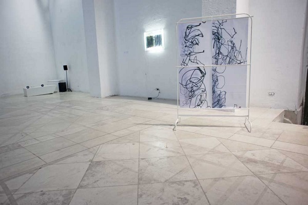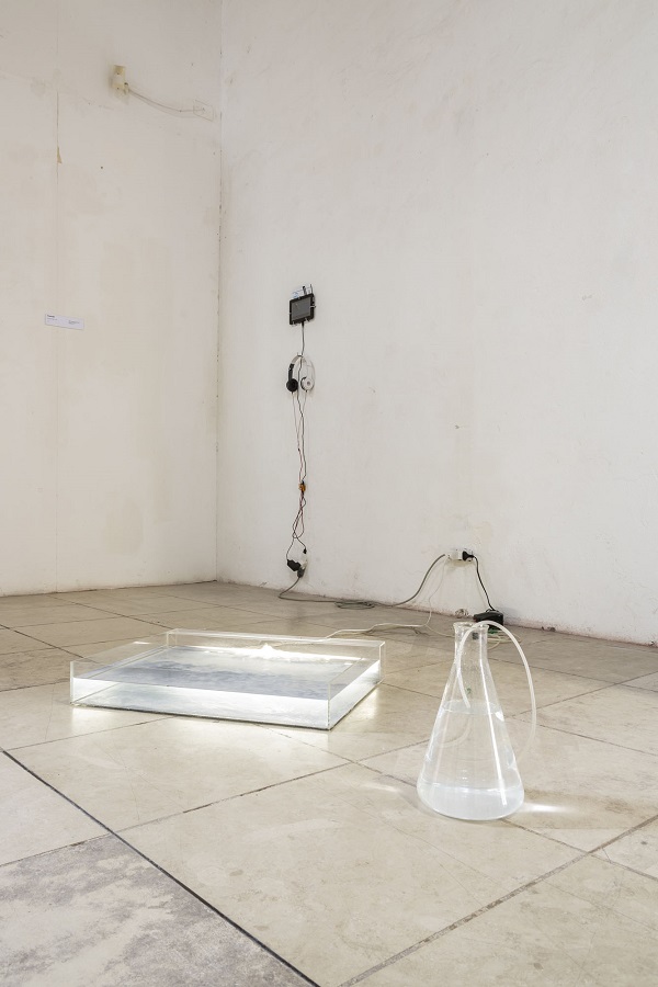Il video proiettato a sinistra è realizzato in postproduzione ed è il risultato di un’ibridazione di più filmati ambientati a Roma e Siracusa che riprendono a camera fissa l’acqua che scorre. La natura si presenta intrappolata nell’opera. L’acqua è indispensabile alla sopravvivenza di tutti, è l’elemento che accomuna gli esseri viventi. Il titolo del video Intimità, suggerisce la fusione della dimensione collettiva e individuale(Fig.3).
