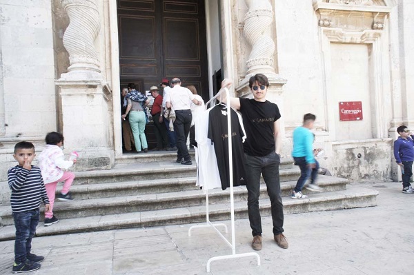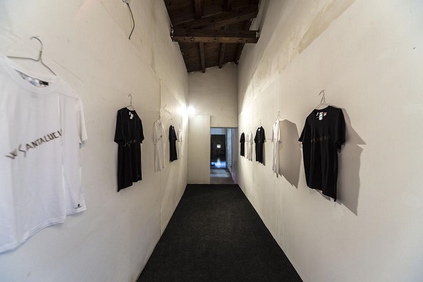 Usciti dalla terza sala ci si trova in un tunnel fatto di magliette dove è stampata la scritta W Santa Lucia con la stessa grafica di quella depositata sulla tavola di legno all’interno del cubo lasciato nella prima sala, forse una sorta di shopper come un dono offerto prima di andare via dalla mostra come fosse un souvenir museale (l’artista regala al pubblico un souvenir).