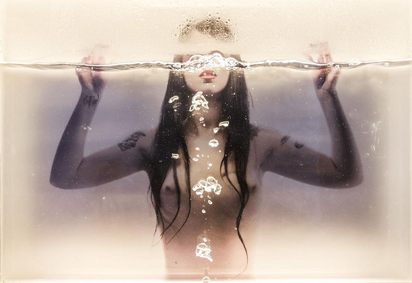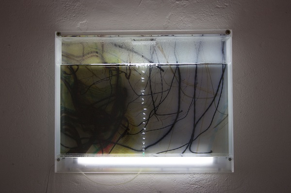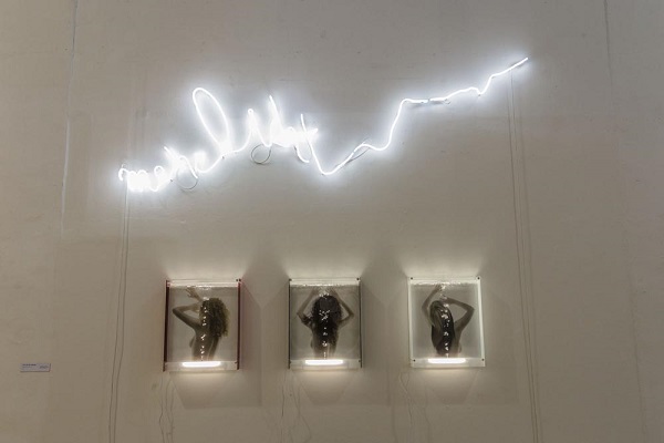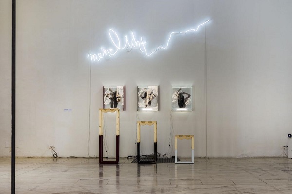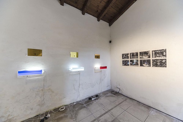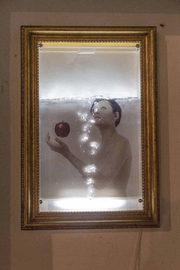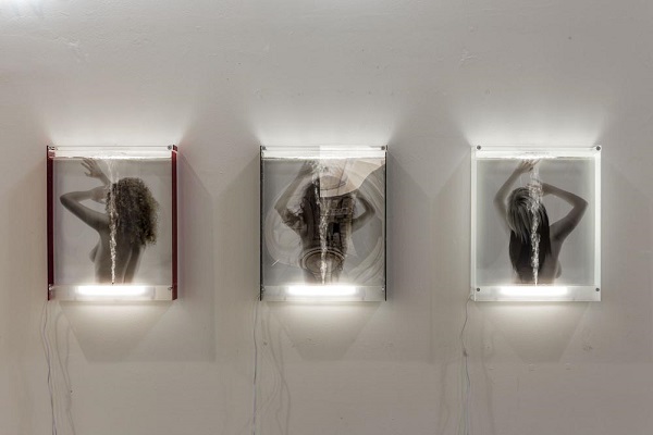 Un lightbox pieno d’acqua sul lato destro dell’entrata contiene la foto di una donna nuda fino al busto che emana una luce neon dagli occhi. Il titolo dell’opera Luce dei miei occhi, un’espressione di uso comune e il gesto di nascondere gli occhi, creano un cortocircuito nel rapporto tra la parola e l’immagine, contenuta nel lightbox. La donna, una Santa Lucia postmoderna, reale nella sua carnalità, presenta un aspetto sacrale conferitogli dalla luce. L’elemento luce è da sempre legato a un’idea biologica e di necessità e si presenta qui nella sua molteplice valenza: può darci la vita ma in sua assenza può portarci alla morte.(Fig.2)