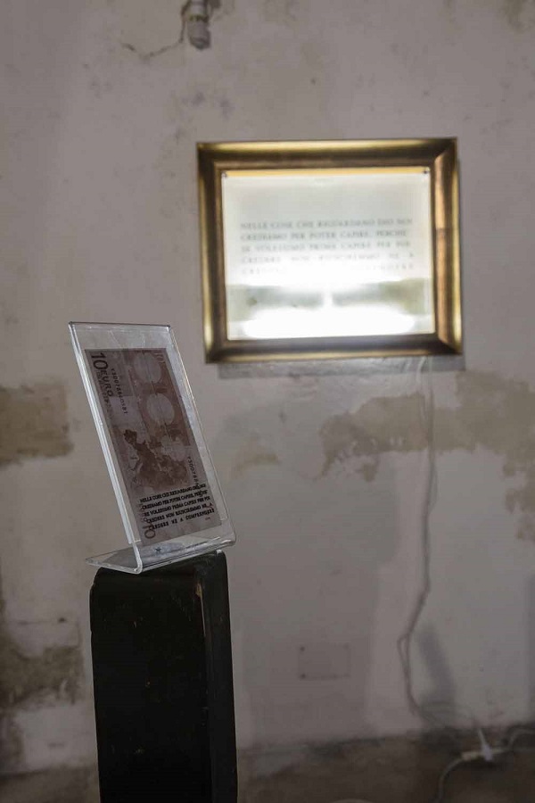 Nella terza sala l’opera Ave Maria racconta una storia che inizia con il ritrovamento casuale di una banconota da dieci euro sulla quale con un timbro è stampata la frase di un anonimo: “nelle cose che riguardano Dio, noi crediamo per poter capire, perché se volessimo prima capire per poi credere non riusciremmo né a credere né a comprendere.” La banconota diventa protagonista di una performance tenuta a Napoli nel 2011, in cui si sono “clonate” altre copie con lo scopo di diffondere il messaggio spirituale tramite il denaro. La banconota originale è stata reinserita nel circuito monetario, quella esposta nell’istallazione è una copia. La frase dell’anonimo si ritrova nel lightbox pieno d’acqua, mentre, un altro lightbox, anche questo con una cornice dorata, contiene la foto di una Eva contemporanea con una mela rossa sospesa, avvolta dal bianco dello sfondo. Il vinile riproduce in loop Ave Maria di Maria Callas, remixata, il cui suono cacofonico entra in contrasto con la sacralità dell’istallazione; la custodia del vinile mostra l’immagine di Dante Alighieri deturpata, con vicino una scritta w il paradiso. Questa frase scritta come se fosse uno slogan e il segno grafico W, che corrisponde a una corona stilizzata, producono una continua oscillazione di senso tra il sacro e il profano, tra la trascendenza e il mondo terreno. La ripetizione dell’elemento musicale porta a una saturazione del significato, l’intima preghiera che l’anonimo ha diffuso proponendo una riflessione sulla fede e la spiritualità che l’artista scolpisce nel lightbox, risulta disturbata dal rumore di fondo. L’opera è costituita da diversi elementi frammentati, tra cui l’inginocchiatoio le cui gambe in ferro sono instabili e questo porta l’osservatore ad un posizionamento precario e oscillante come la vita stessa (Fig. 7).