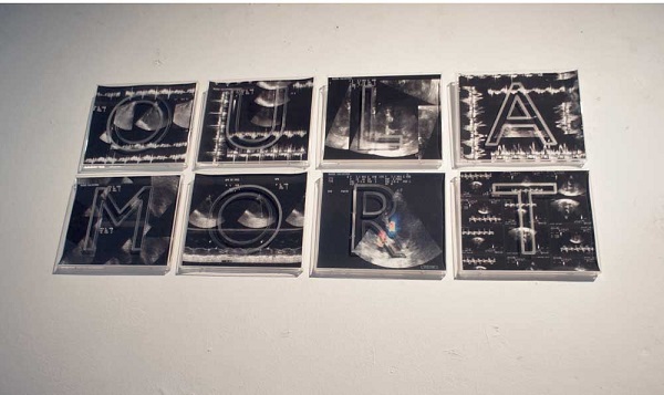 L’opera Ou la mort è collocata in una delle stanze del vecchio monastero. Le lapidi di ottone, come quelle di un funerale, riportano ognuna le parole d’ordine della rivoluzione francese; sotto di queste, sono posizionate tre mensole piene d’acqua, contrassegnate con una lastra dal simbolo X: non rinnega i valori ma stimola una riflessione. I valori della fraternità, dell’uguaglianza e della libertà sono nati? sono morti, non esistono più? Il quesito pone l’individuo di fronte a un bivio esistenziale: bisogna ottenere di nuovo questi valori in nome della libertà a costo della vita? oppure bisogna attendere l’annullamento dell’individuo stesso all’interno della società a causa della mancanza di questi valori? L’opera si presenta come un’analisi della società contemporanea attraverso l’autoritratto interiore dell’artista che pone negli otto lightbox le foto remixate del suo ecocardio, il cui suono completa l’istallazione(Fig. 6).