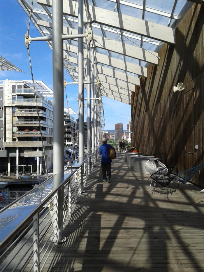 Ma questa parte non è l’unica costiera ad essere stata risanata, anche il lato occidentale della baia, è stato oggetto di una radicale trasformazione: da area portuale a raffinata zona abitativa, con locali alla moda, gallerie d’arte, un parco di sculture e il museo privato d’arte contemporanea Astrup Fearnley, fondato nel 1993 e qui trasferitosi nel 2012. I tre plessi (18) in cui si articola quest’ultimo si collocano alla fine del lungo molo di Akker Brygge, un tempo sede di cantieri navali. Il museo – caratterizzato dalla più aggiornata collezione d’arte contemporanea del nord Europa – è stato progettato da Renzo Piano (19) che ha voluto conferirgli l’aspetto di un natante approdato alla banchina, tutto rivestito di legno, protetto da una vela latina obliqua in vetro trasparente e collegato alla terra con ponti passerella che superano il canale. Qui non ci sono “piazze” interne accessibili ma i passaggi ponte permettono l’accesso alla spiaggia e al mare circostante.