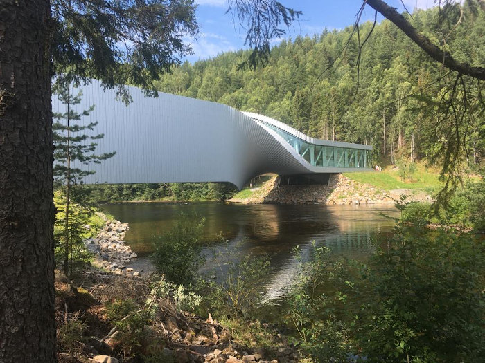 Di genere diametralmente opposto, ovvero molto iconico e spettacolare, è l’intervento di Bjarke Ingels nei pressi di Oslo, a Kistefos. Tanto famoso da non poter essere ignorato trattando di architettura contemporanea norvegese e che ha fatto parlare di sé tutte le riviste del settore nel 2019 quando The Twist, questo l’appellativo scelto, è stato inaugurato. Si tratta di una costruzione che è al contempo un ponte, una galleria espositiva e un’opera d’arte, non a caso l’intervento si inserisce nel parco delle sculture di Jevnaker (24), a 70 km da Oslo. La costruzione ha la forma di un parallelepipedo a cavallo del fiume Randselva e circa a metà compie una torsione su sé stessa di 90 gradi. Costruito da pannelli di alluminio rivestiti internamente con doghe di abete dipinte di bianco, presenta proprio nella torsione un lato di vetro che da lucernaio superiore si trasforma poi in parete trasparente: una parte della galleria protegge le opere dalla luce esterna, l’altro si apre al paesaggio dei boschi e del fiume.