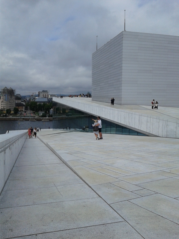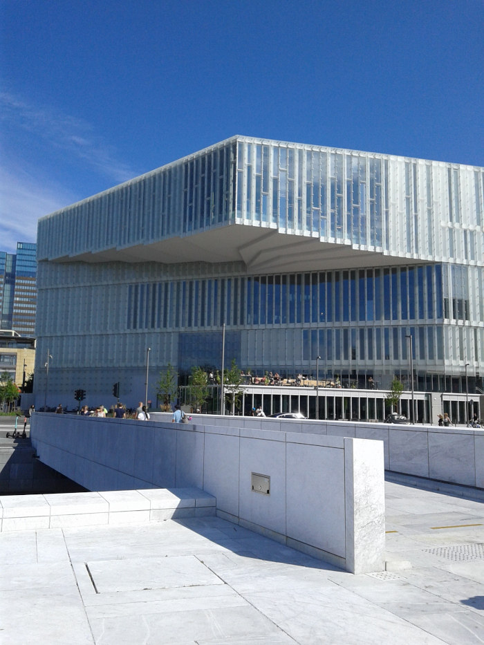 L’intervento che ha innescato la ridefinizione di questa zona, è stato il progetto per il Teatro Nazionale dell’Opera e del Balletto avviato con il concorso del 2000 su committenza governativa (8). Vincitore della competizione internazionale è stato il gruppo norvegese Snøhetta (9) che ha saputo conciliare l’alta funzionalità tecnica con una forma originale ed incisiva, in perfetta armonia con il paesaggio. Salendo con andamento obliquo direttamente dall’acqua del mare, l’ingente costruzione del teatro, che insiste su 38 mila mq di superficie, si presenta come un immenso blocco di ghiaccio, un iceberg che la corrente sembra aver incastrato contro la banchina del porto. Il materiale utilizzato è infatti il candido marmo di Carrara che emergendo dall’acqua diventa piazzale di accesso per poi trasformarsi, inclinandosi, in tetto percorribile dell’intera struttura (10). Solo in cima assume ancora un andamento orizzontale per poi inerpicarsi di nuovo in senso contrario ed offrire nel punto più alto, la vista sul fiordo e sulla città. Nel basamento quadrangolare sul retro prendono posto, nei 1100 ambienti presenti, gli uffici e laboratori che contribuiscono alla realizzazione degli spettacoli – falegnameria, sartoria, scenotecnica, regia, scenografia… – questi ultimi a vista sulla strada confinante. Il rapporto con la città non è soltanto visivo, la hall di accesso, con pareti interamente vetrate alte 15 metri, è infatti accessibile a tutti, con i servizi, il ristoro, i sedili: una piazza protetta che prosegue la grande area esterna. Il cuore del complesso, le due sale da 1350 e 400 posti, sono accessibili con una rampa che sale ad elica, realizzata e schermata con lastre di quercia dorata. Il freddo del “ghiaccio” lascia il posto al calore avvolgente del legno con un evidente omaggio, nel sapiente alternarsi dei materiali, agli insegnamenti del maestro nordico per eccellenza, Alvar Aalto.