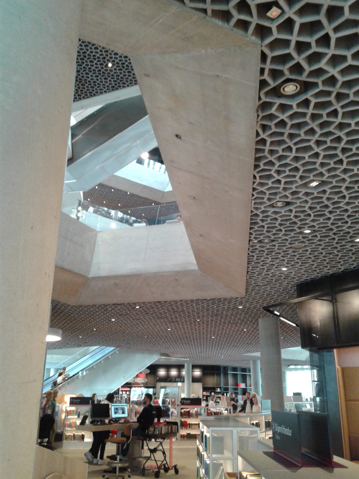 Ma varcato l’accesso ci si trova in un ambiente architettonicamente dinamico ed avvolgente. Le scale mobili invitano a scoprire la chiostra dei ballatoi che si intuiscono in verticale perché non tutti i piani si offrono alla vista contemporaneamente e il vasto ambiente in cima ci appare del tutto inaspettato, inondato di luce dalle pareti vetrate e dal soffitto. Ovunque poltrone e sedie diverse, tutte di ricercato design, isolate o in piccoli raggruppamenti, tavoli, computer, libri liberamente consultabili, difficile non trovare un angolo che non faccia alle proprie esigenze. E poi aree per i bambini, sale dove richiedere la proiezione di film, laboratori dove imparare a suonare strumenti musicali, macchine da cucire, stampanti 3D, sale di riunione in cui poter avviare personali iniziative, insomma una biblioteca con una pluralità di funzioni, liberamente accessibile secondo una politica culturale aperta ed inclusiva che i Paesi del nord Europa hanno avviato da tempo scommettendo proprio sul ruolo altamente educativo di queste istituzioni (15).
